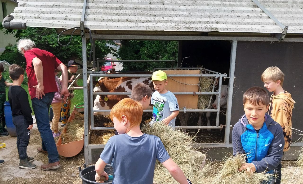 Unsere 2.Klasse verbrachte im Rahmen des HSU-Unterrichts einen Vormittag im Frischluft-Klassenzimmer der Familie Reichel/Meyer. Wir lernten, wie Kälbchen aufwachsen und wie sie sich wohl fühlen. Auch die Versorgung der Hühner stand auf dem Programm. Nach einigen spannenden Stunden voller Aufgaben und Informationen, durften wir uns noch bei frisch gebackenen Waffeln und Erdbeershake stärken. Vielen Dank an Familie Meyer/Reichel für dieses tolle Erlebnis!