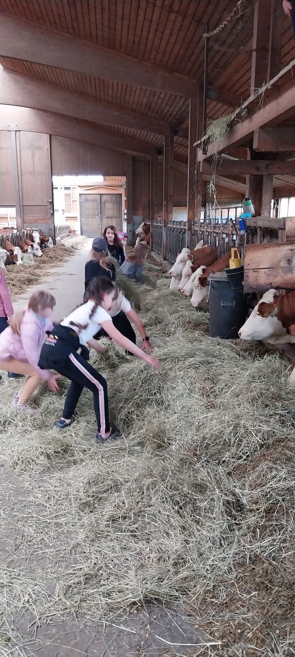 Im Zuge der Woche der Nachhaltigkeit besuchte die 6. Klasse den Bio-Bauernhof Ritter. Andi erklärte und sehr lebendig und anschaulich, was es bedeutet, an einem Bio-Bauernhof zu arbeiten oder warum man keine Erdbeeren zu Weihnachten essen sollte. Bei den Produkten am Hof werden keine chemischen Substanzen hinzugefügt und das Gemüsefeld wird per Handarbeit abgeerntet. Die Kühe leben wie bei einer Familie beieinander. 16 Stunden Arbeit sind auf dem Hof keine Seltenheit, denn nur so ist es möglich, dass die 76 Hektar große Fläche zu bewirtschaften und die 3170 Hühner zu ernähren sind. Andi ließ uns auch von seinen Produkten probieren und zeigte uns die Maschinen sowie das Vieh. Schließlich gab er uns noch Kartoffeln und Eier mit, die wir uns anschließend in der Schulküche als Bratkartoffeln mit Rühr -oder Spiegeleiern schmecken ließen.