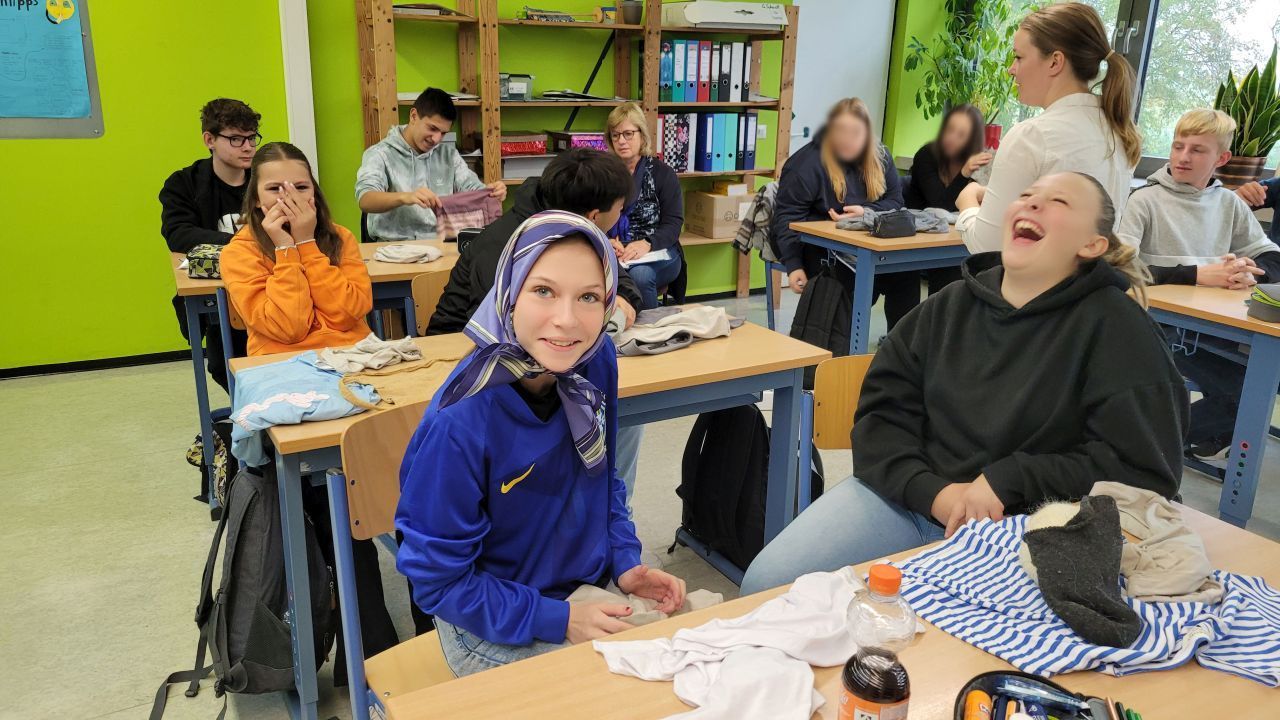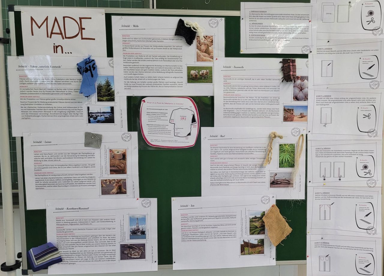 „Made in …“ – erzählt uns dieser Spruch tatsächlich, wo unsere Kleidung herkommt? In der „Woche der Nachhaltigkeit“ folgte die 9. Klasse der textilen Verarbeitungskette vom Baumwollanbau bis zur Konfektion in Sweat-Shops. Es konnten Umweltbelastungen oder negative soziale Auswirkungen angesprochen werden. Spielerisch konnten die Schüler verschiedene textile Materialien bzw. die Rohstoffe zur Herstellung von Textilien kennen lernen. Sie erfuhren deren Herkunft und die mit der Rohstoffgewinnung bzw. dem Anbau verbundenen Probleme. In einem abschließenden „Fabrikspiel“ konnten die Schüler die Situationen des Zeitdrucks, des Stresses und der Arbeitssituation in den Produktionsstätten unserer Kleidung nachempfinden.