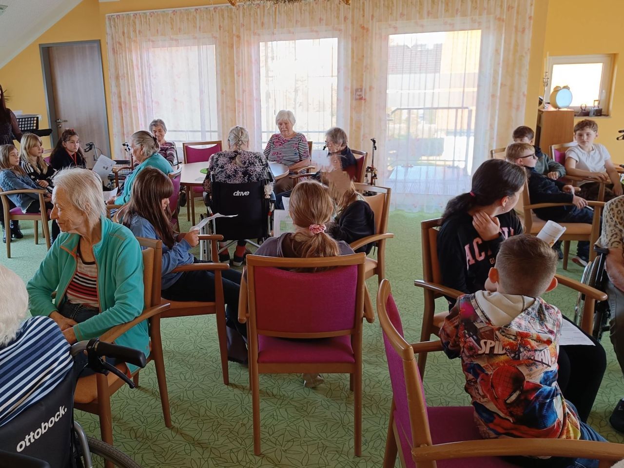 Die 4. Klasse besuchte das Pflegeheim Haus Epprechtstein und wurde von den Bewohnern freudig empfangen. Nach einer musikalischen Begrüßung lauschten die Senioren aufmerksam den Geschichten, die ihnen vorgelesen wurden. Zum Abschluss wurde gemeinsam das Lied „Der Wind, der alte Musikant“ gesungen und die Klasse erhielt als Dankeschön kleine gebastelte Karten.