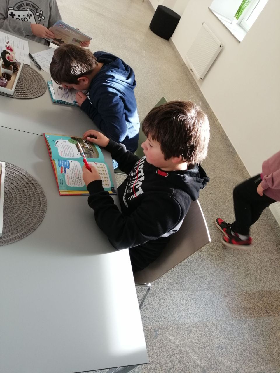 Erste Station war die Buchhandlung Nerb. Dort stöberten die Schülerinnen und Schüler in den Regalen und konnten dabei das ein oder andere interessante Buch finden und kaufen. Jeder bekam außerdem das Buch "Mission Roboter" geschenkt, das in beiden Klassen als Lektüre im Unterricht gelesen wird.