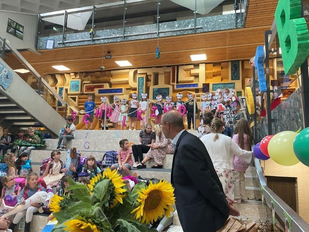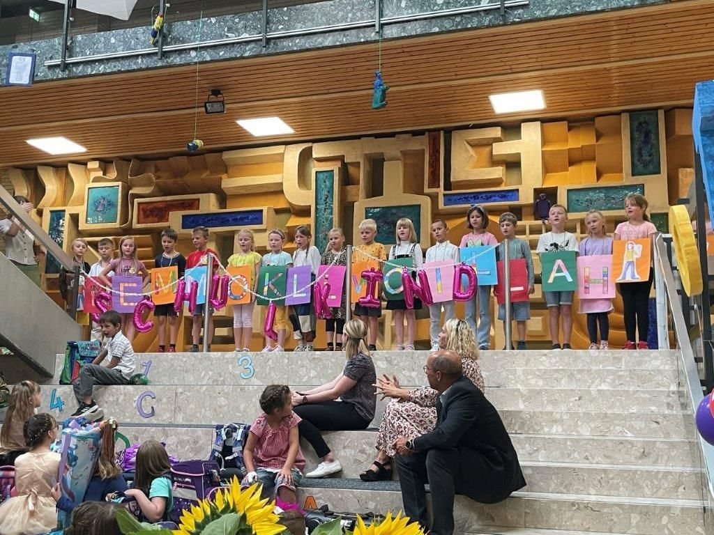 Aufs Herzlichste wurden die neuen Erstklässler/innen in unserer Schule begrüßt. Die 2. und 3. Klasse hießen die Schulanfänger/innen mit einem Lied und einem Sprechstück willkommen. Frau Diakonin Richter gestaltete eine kleine ökumenische Andacht. Schulleiter Martin Bergmann, 1. Bürgermeister Jens Büttner und der Vorsitzende unseres Fördervereins, Herr Rudolf Röll, gaben den ABC-Schützen die besten Wünsche mit auf den Weg. Vom Förderverein bekamen die Kinder eine Willkommenstüte mit leckerem Inhalt.