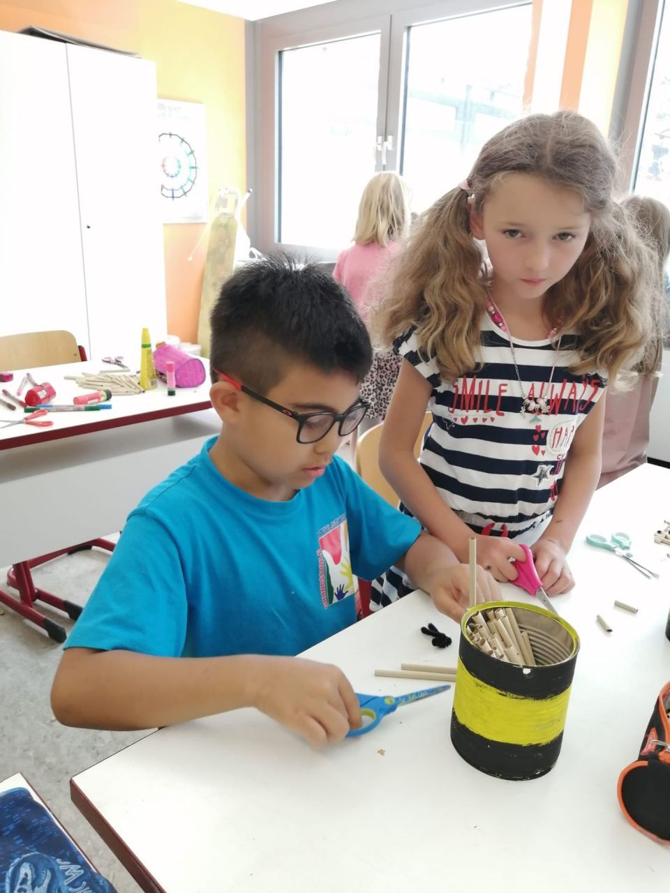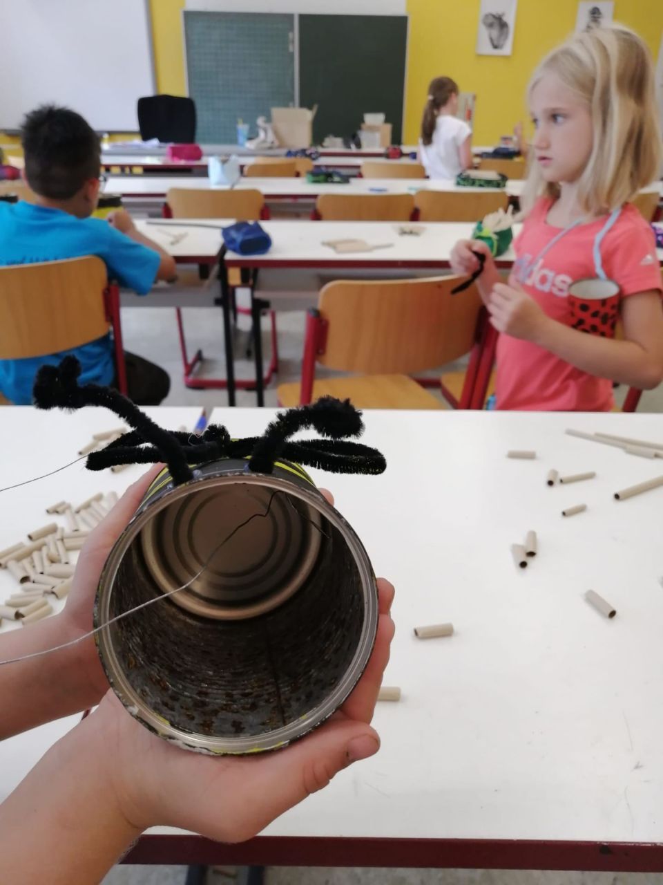Die Kinder der beiden Klassen 1a und 1b hatten sich im Heimat- und Sachunterricht mit Pflanzen und Tieren der heimischen Wiese beschäftigt. Zum Abschluss der Einheit gestalteten die Kinder ein Insektenhotel aus einer alten Konservendose. Nachdem die Kinder ihre Insektenhotels als Biene oder Marienkäfer angemalt hatten, wurden die Dosen mit Füllmaterialen wie Nisthülsen, Heu und Kieferzapfen befüllt. Die fertigen Insektenhotels nahmen die Kinder mit nach Hause, um sie im Garten aufzuhängen und Insekten einen neuen Lebensraum zu bieten.