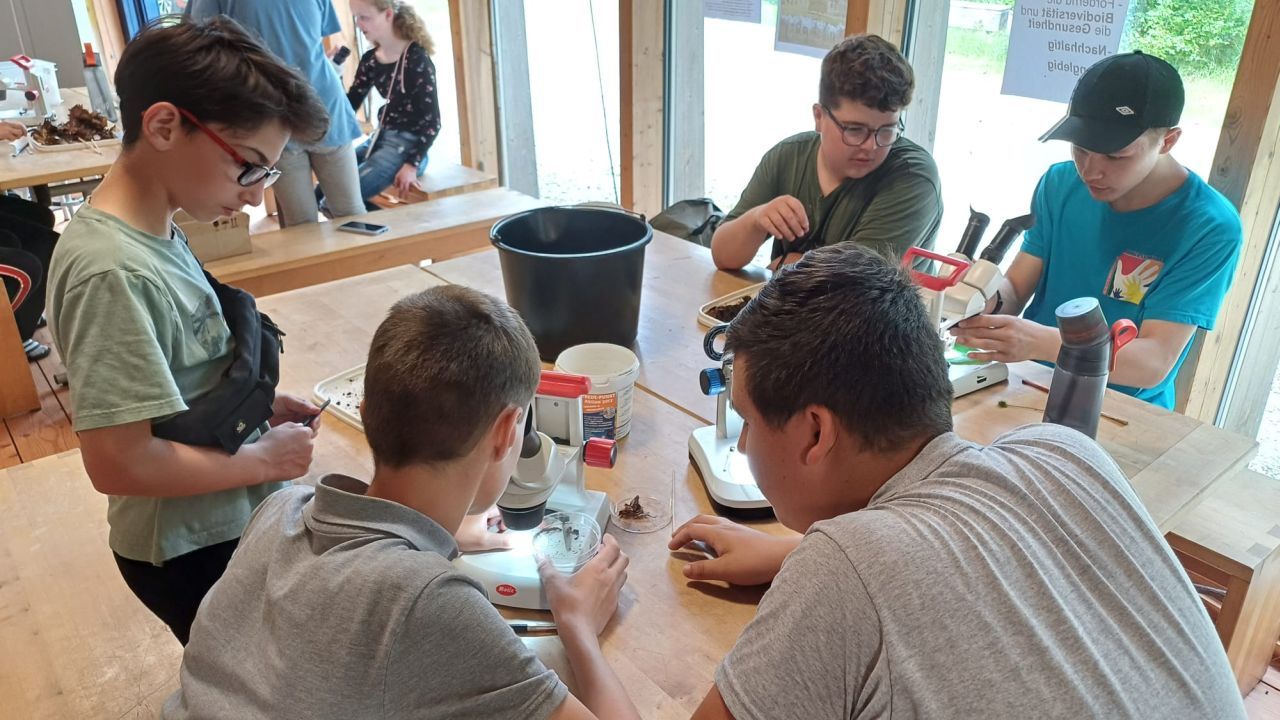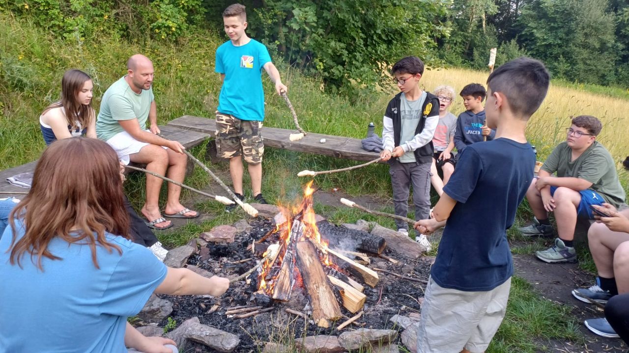 Dank der tollen Lage des Schullandheims konnten Ausflüge in die Umgebung geplant werden. Am ersten Tag besuchte die Klasse nach einer Orientierungsrallye am Katharinenberg den Lernort Natur, wo man sich mit dem Thema „Wald und Bäume“ beschäftigte. Dort durften die Jugendlichen selbst Bäume bestimmen oder auch den Boden mikroskopieren, was zu erstaunlichen Entdeckungen führte, was perfekt zu unserer Naturparkschule passte. Nachdem sich anschließend bei einem Eis gestärkt wurde, bereitete man sich für den Abend vor. Hier wurde ein Lagerfeuer geschürt, an dem Wiener, Kartoffeln oder Marshmallows zubereitet wurden.