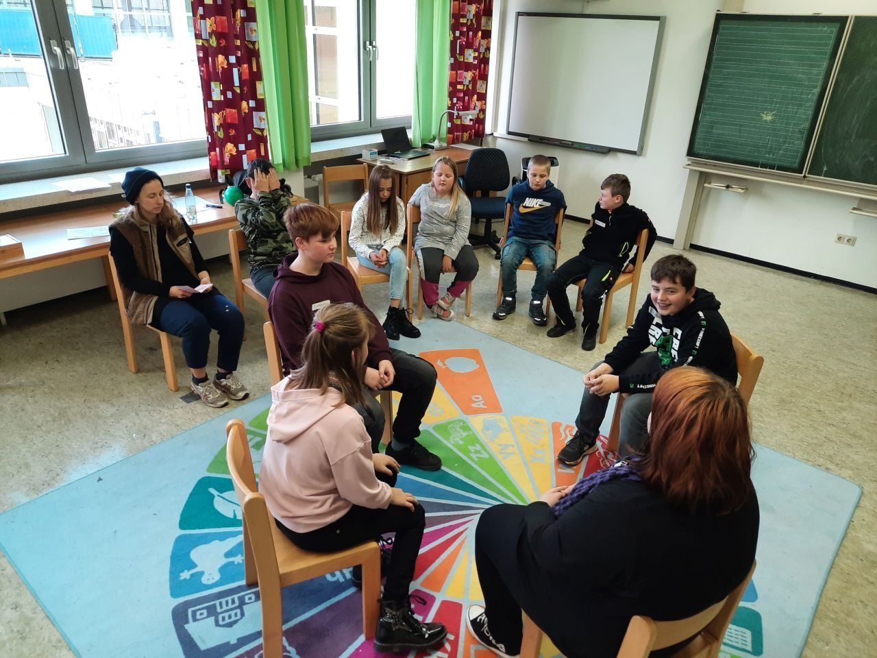 Im Rahmen der Kooperation mit dem Theater Hof (Junges Theater Hof) konnten 10 Schülerinnen und Schüler aus den Klassen 5, 6, 7 und 9 an einem Theater-Workshop mit einer Theaterpädagogin teilnehmen. Zum Thema „Utopia/ Ich habe Chancen – ich nutze Chancen“ sammelten die Teilnehmer/innen wichtige Erfahrungen und zeigten dabei, wie gut sie Gefühle und Beobachtungen artikulieren können. Am zweiten Nachmittag durfte die Gruppe hinter die Kulissen des Theaters Hof blicken. Alle waren beeindruckt, was alles notwendig ist, damit eine Theaterinszenierung erfolgreich sein kann.