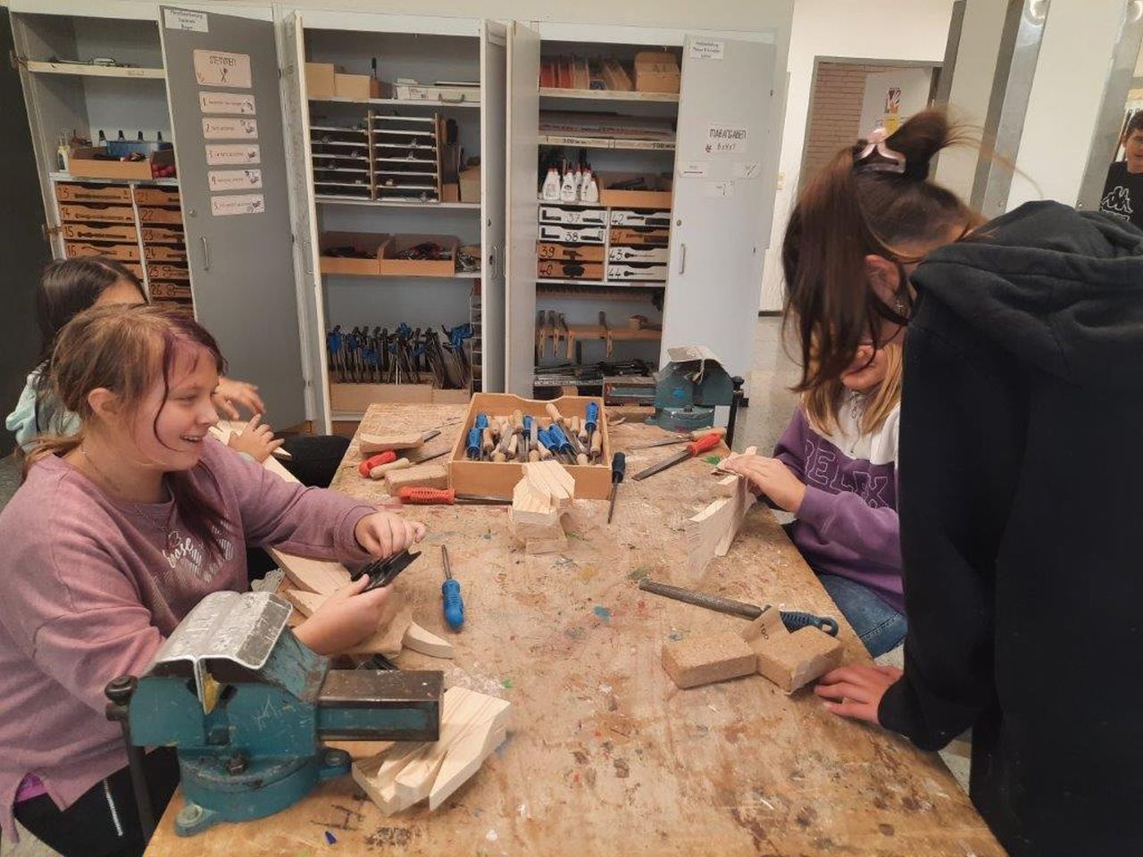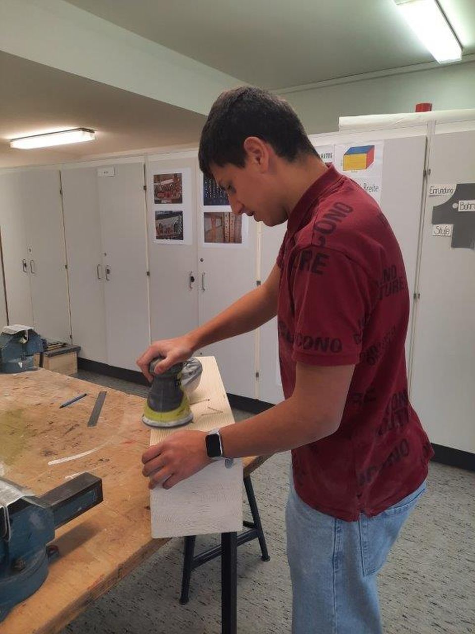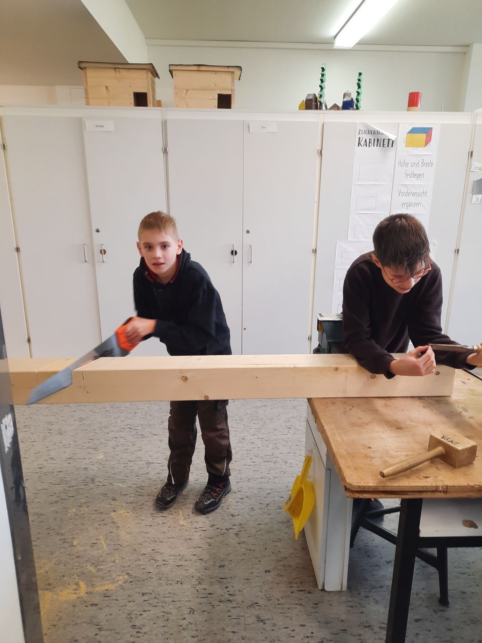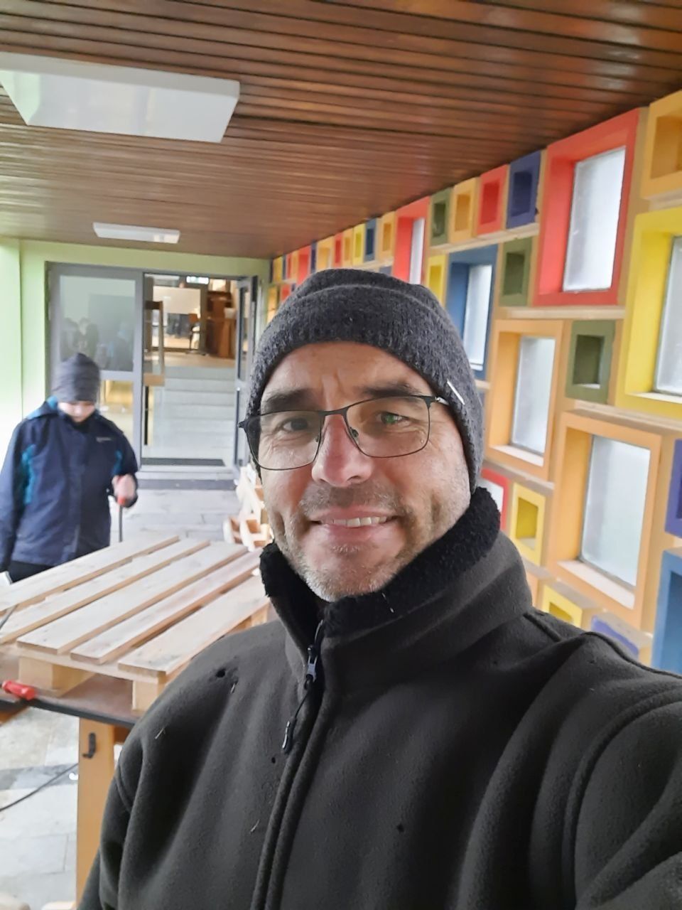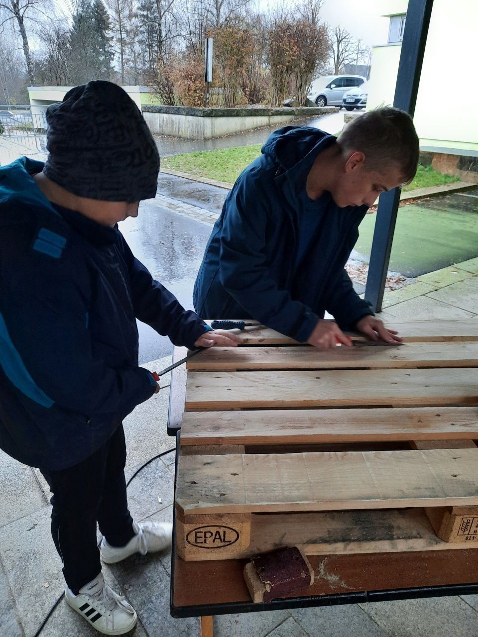Da das Interesse am Bau von Palettenmöbeln so groß war, wurde eine zweite Gruppe gebildet, welche Sitzgelegenheiten für den Bereich beim Schulaquarium bauten. Alle Handwerker zeigten dabei großes Interesse und Talent im Umgang mit Holz, Maschinen und Farbe. Mittlerweile werden die Sitzmöbel gerne von Kindern angenommen, um dort z.B. ihre Mittagspause zu verbringen...
