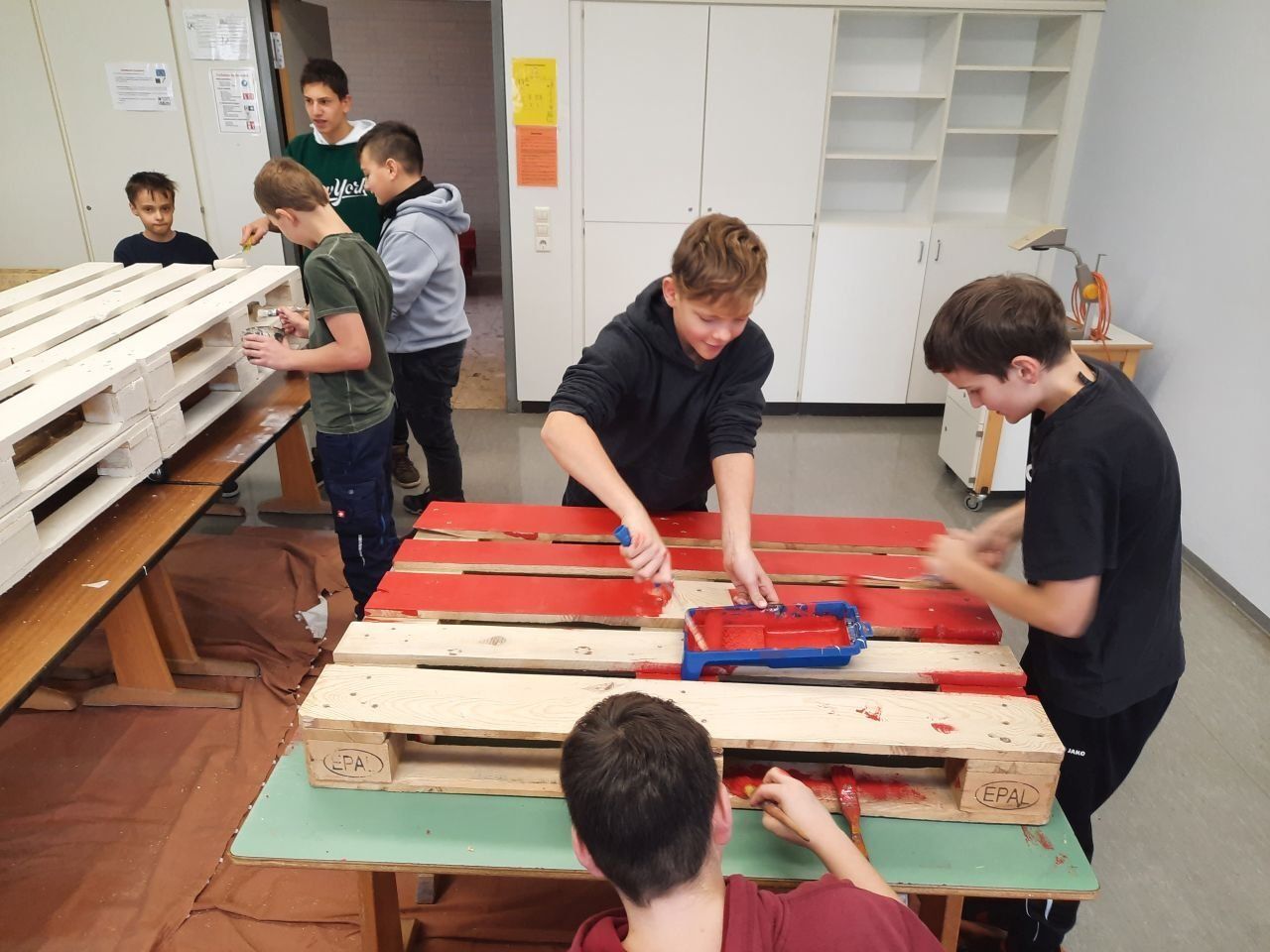 Für dieses TAFF-Modul übernahm der Förderverein unserer Schule die Kosten für 18 Euro-Paletten, die wir zum Bau von Sofas und Sesseln benötigten. An drei Nachmittagen bearbeiteten die Teilnehmer aus den Klassen 5 – 8 die Oberfläche der Paletten, anschließend erfolgten die Konstruktion und Montage sowie die farbliche Gestaltung. Aufgrund der hohen Nachfrage nach diesem TAFF-Modul wird im Frühjahr ein weiterer Durchgang mit anderen Schülern erfolgen. Der Plan ist, für den Bereich beim Aquarium auch Sitzgelegenheiten zu bauen.