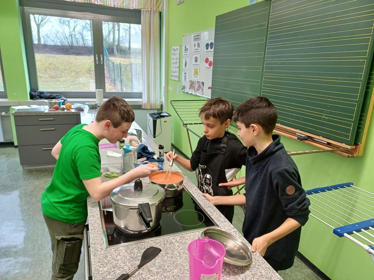 An zwei Nachmittagen hatten die Schülerinnen und Schüler der Klassen 5 bis 8 den Auftrag, selbstständig ein Dreigängemenü zu planen, dafür einzukaufen und die Speisen zuzubereiten. Anschließend konnte sich die gesamte Gruppe gemeinsam mit den köstlichen Speisen stärken.